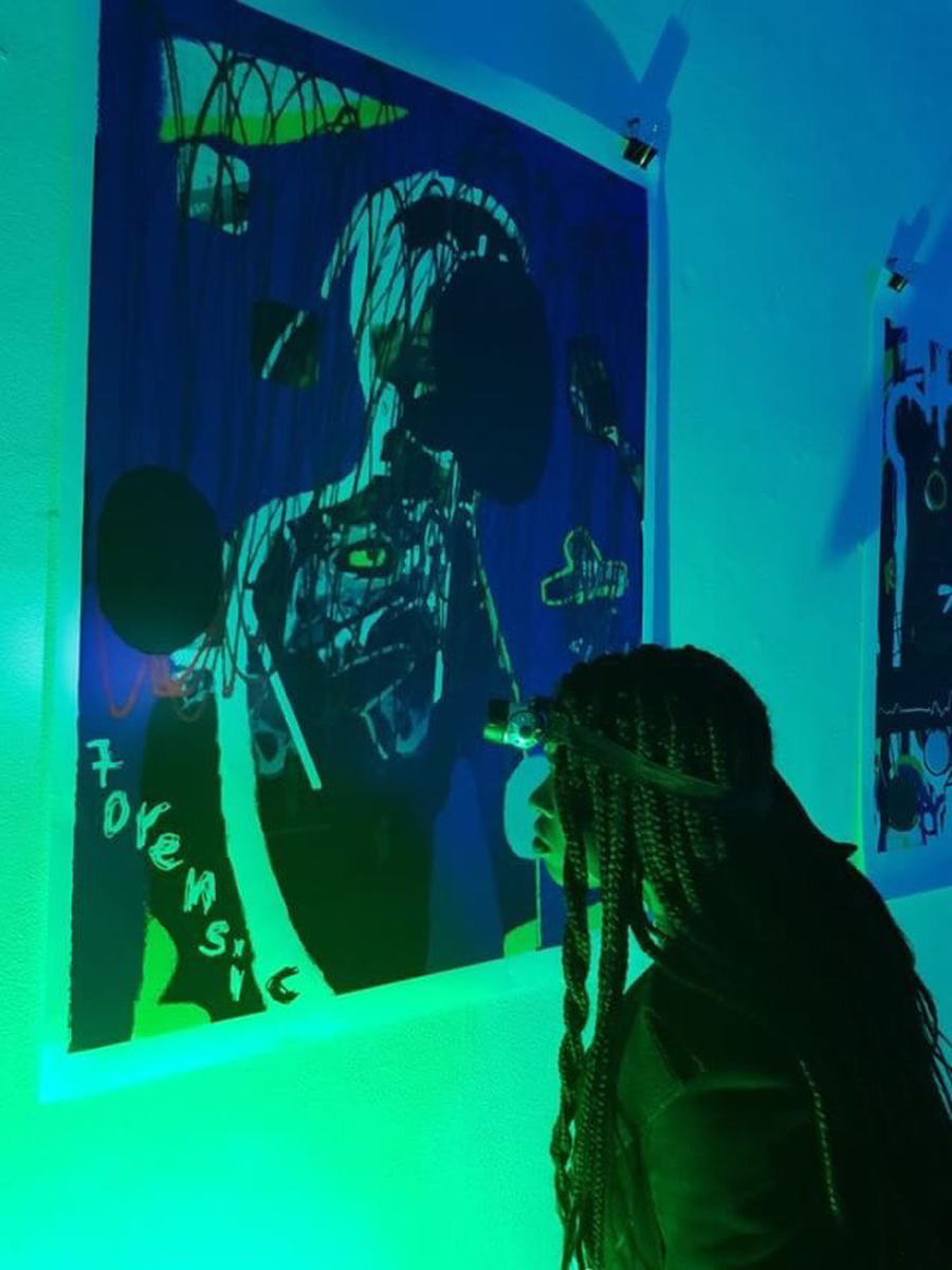 Coloured lights beamed from the floor and reflected onto selected pieces of Eugene’s work, with each different colour cleverly evoking various perspectives and drawing the captivating infusion of energies embedded within his work. This created a profoundly cosmic atmosphere in the whole room. It was quite magical.
