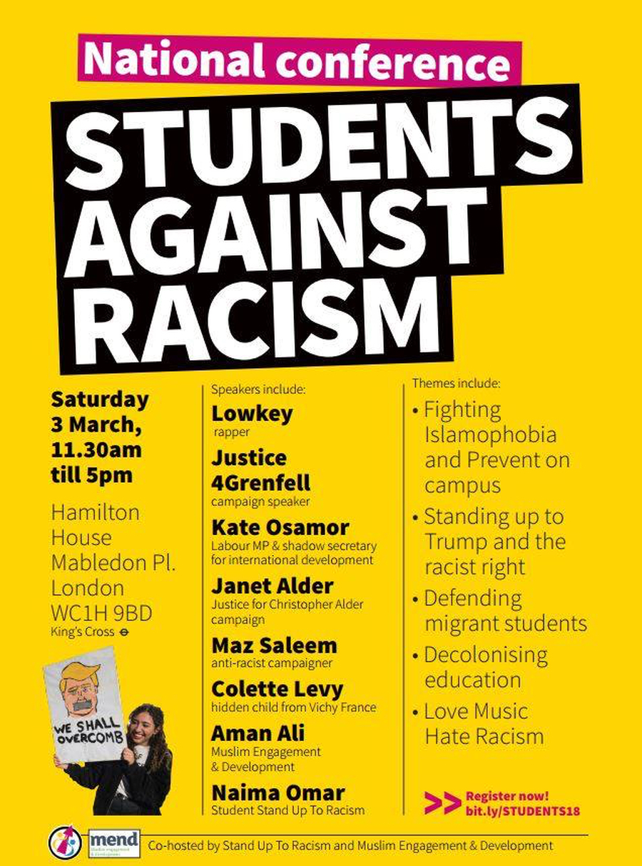 It will also be addressed by Amal Bider, anti-racist activist and Goldsmiths BME officer; Care4Calais; Austrian anti-fascist; Faisal Haji, Kingston SU; Isabel Kingscott, MEND and Naima Omar, Stand Up to Racism.
